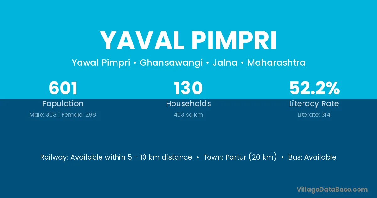 Partur (20 km) is the nearest town to Yaval Pimpri village for major economic activities and is located approximately 20 km away.