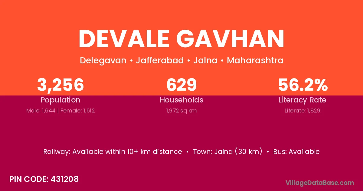 Jalna (30 km) is the nearest town to Devale Gavhan village for major economic activities and is located approximately 30 km away.