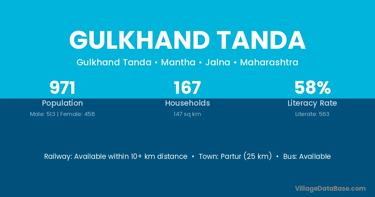 Partur (25 km) is the nearest town to Gulkhand Tanda village for major economic activities and is located approximately 25 km away.