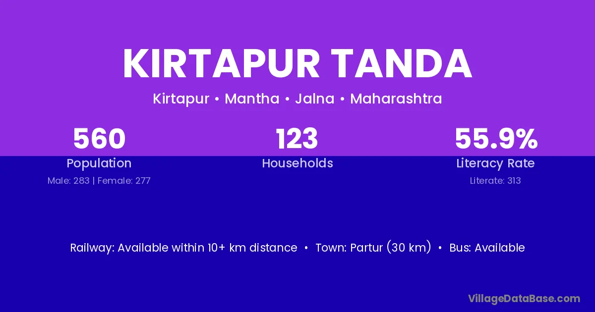 Partur (30 km) is the nearest town to Kirtapur Tanda village for major economic activities and is located approximately 30 km away.