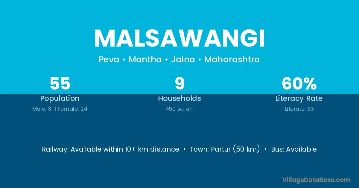 Partur (50 km) is the nearest town to Malsawangi village for major economic activities and is located approximately 50 km away.