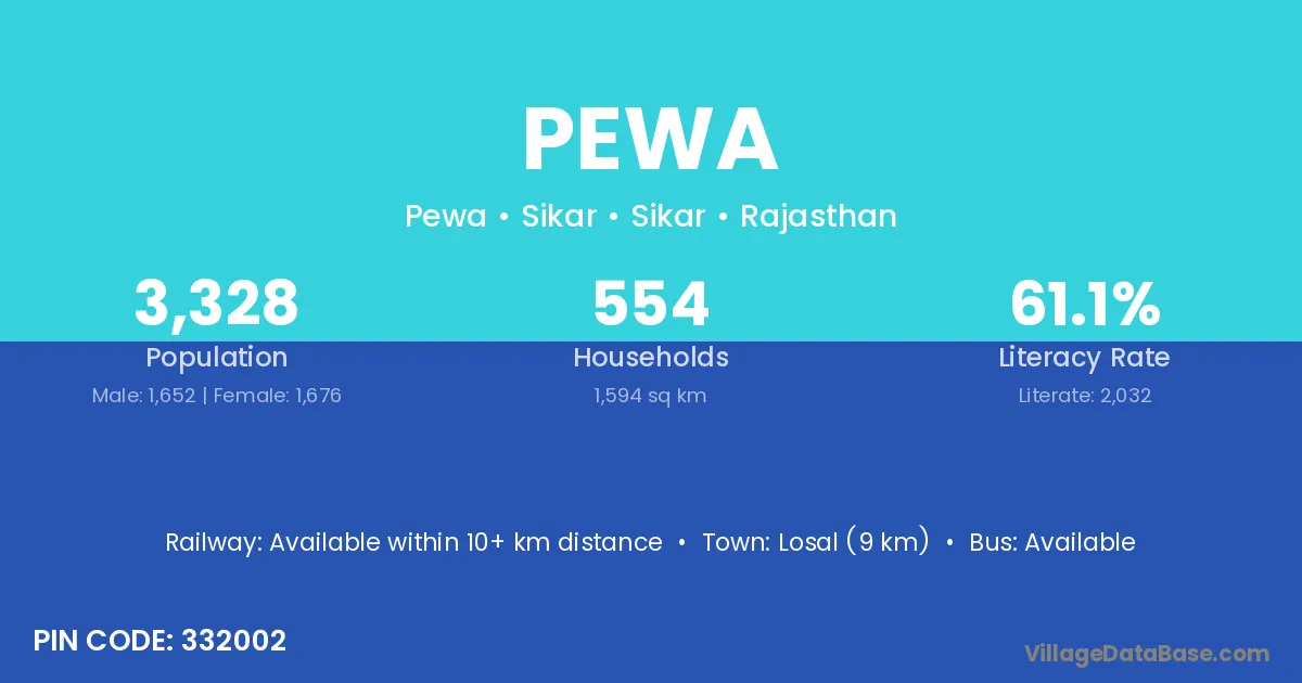 The literacy rate of Pewa village is 57.75%. Male literacy stands at 67.04% and female literacy at 48.20%.