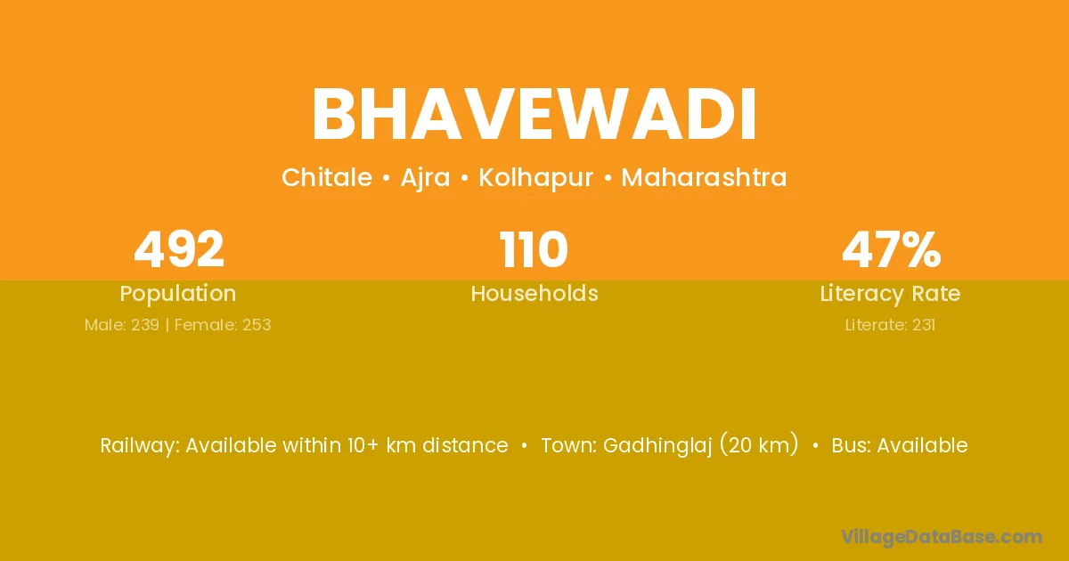 Gadhinglaj (20 km) is the nearest town to Bhavewadi village for major economic activities and is located approximately 20 km away.