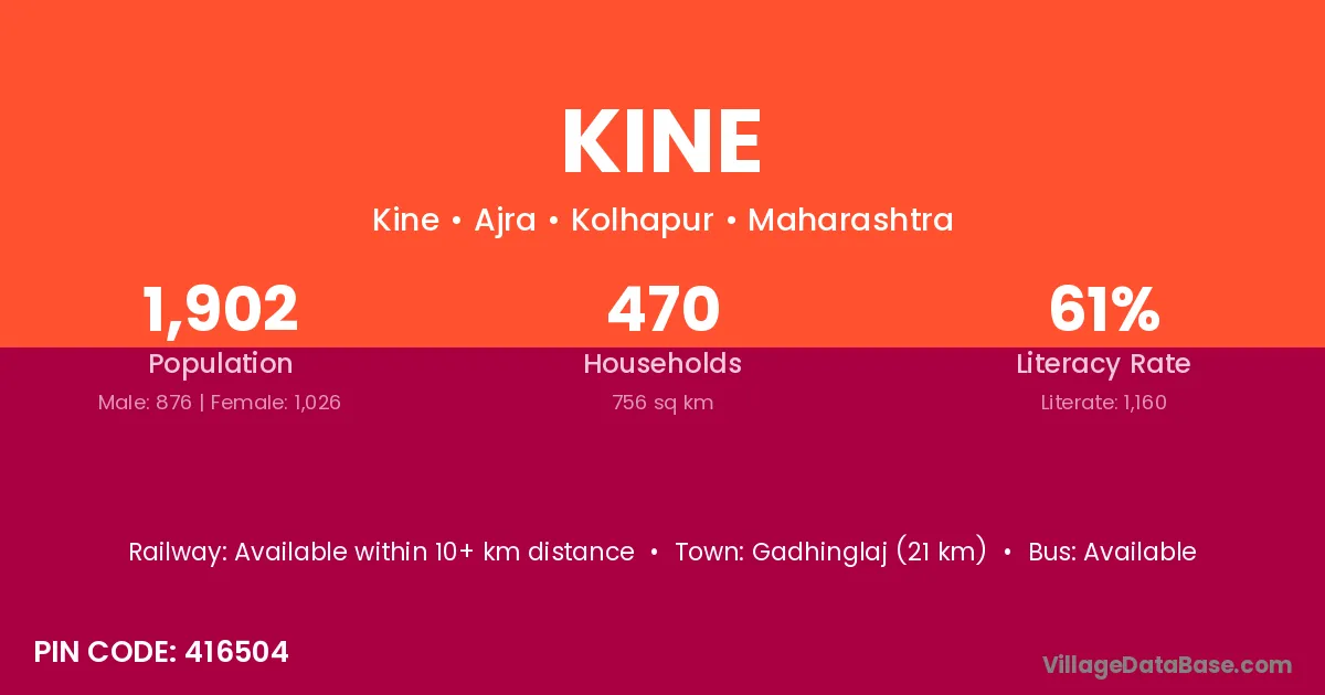 Gadhinglaj (21 km) is the nearest town to Kine village for major economic activities and is located approximately 21 km away.
