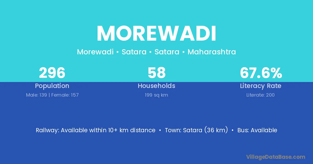 The literacy rate of Morewadi village is 58.99%. Male literacy stands at 67.78% and female literacy at 50.00%.