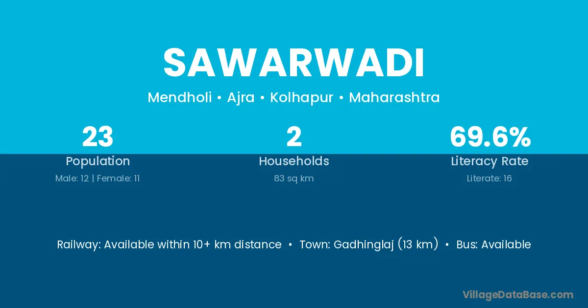 Sawarwadi village has a total population of 23 people, of which 12 are males and 11 are females.