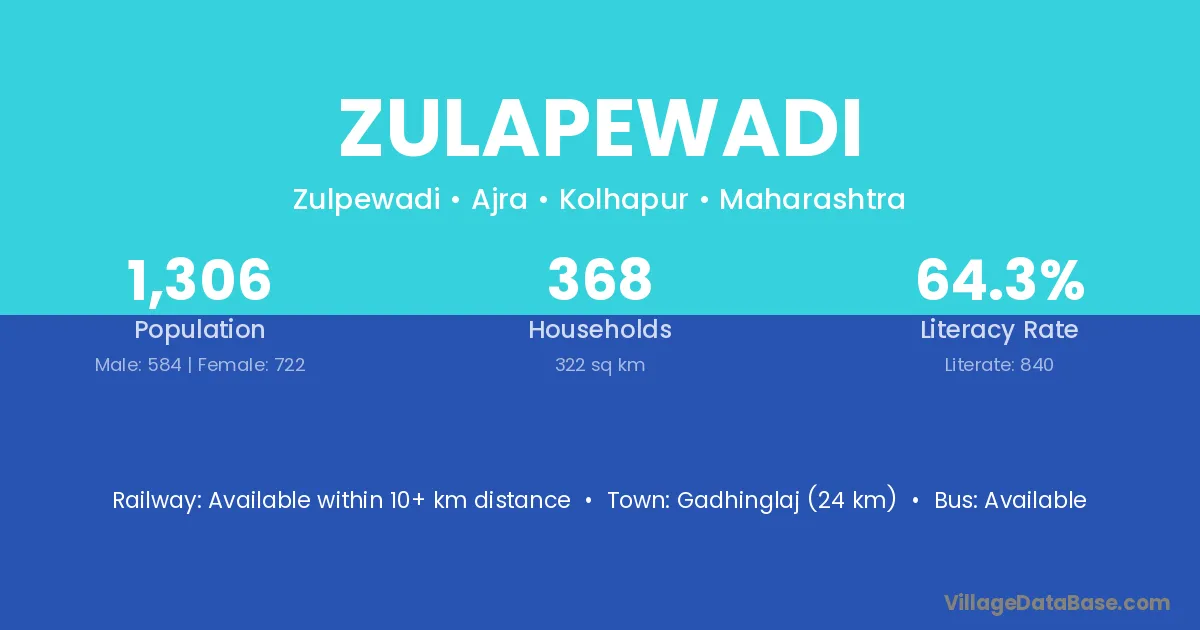 Gadhinglaj (24 km) is the nearest town to Zulapewadi village for major economic activities and is located approximately 24 km away.