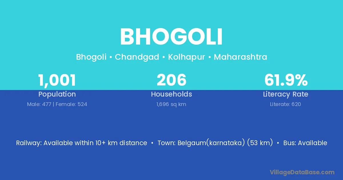 Belgaum(karnataka) (53 km) is the nearest town to Bhogoli village for major economic activities and is located approximately 53 km away.