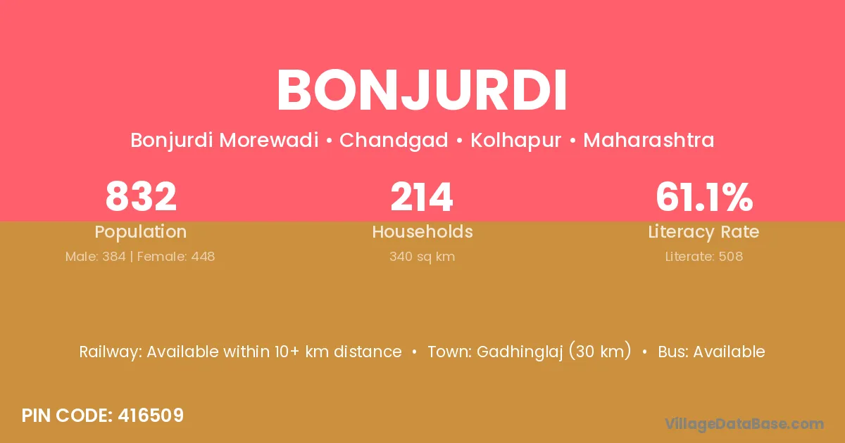 Gadhinglaj (30 km) is the nearest town to Bonjurdi village for major economic activities and is located approximately 30 km away.