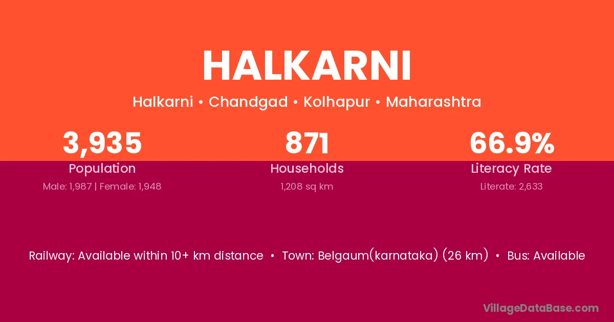 Halkarni village has a total population of 3,935 people, of which 1,987 are males and 1,948 are females.