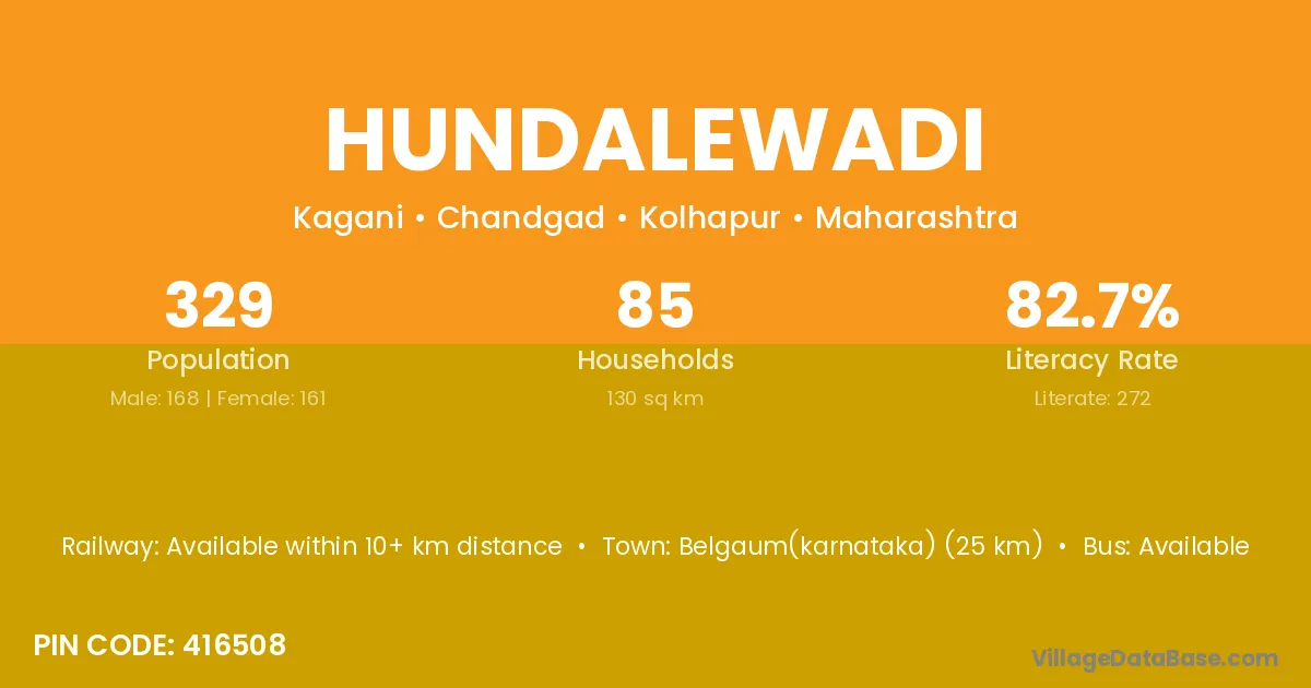 Hundalewadi village has a total population of 329 people, of which 168 are males and 161 are females.