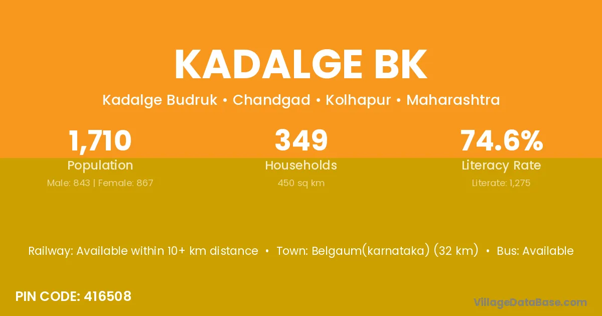 Kadalge Bk village has a total population of 1,710 people, of which 843 are males and 867 are females.