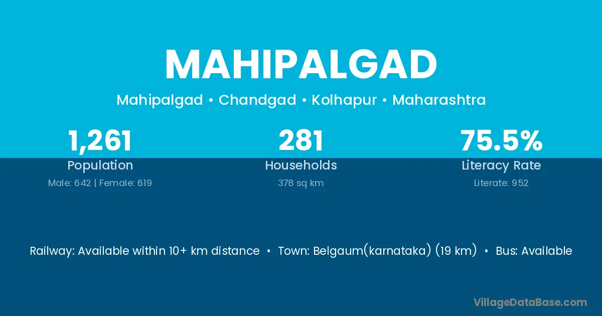 Belgaum(karnataka) (19 km) is the nearest town to Mahipalgad village for major economic activities and is located approximately 19 km away.