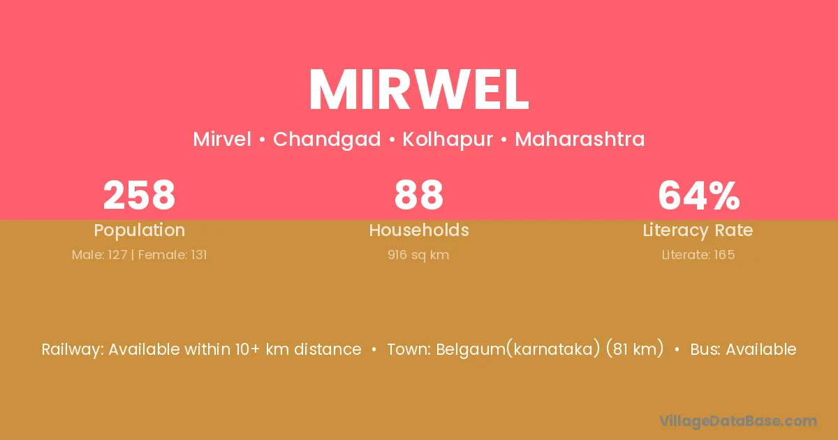 Belgaum(karnataka) (81 km) is the nearest town to Mirwel village for major economic activities and is located approximately 81 km away.