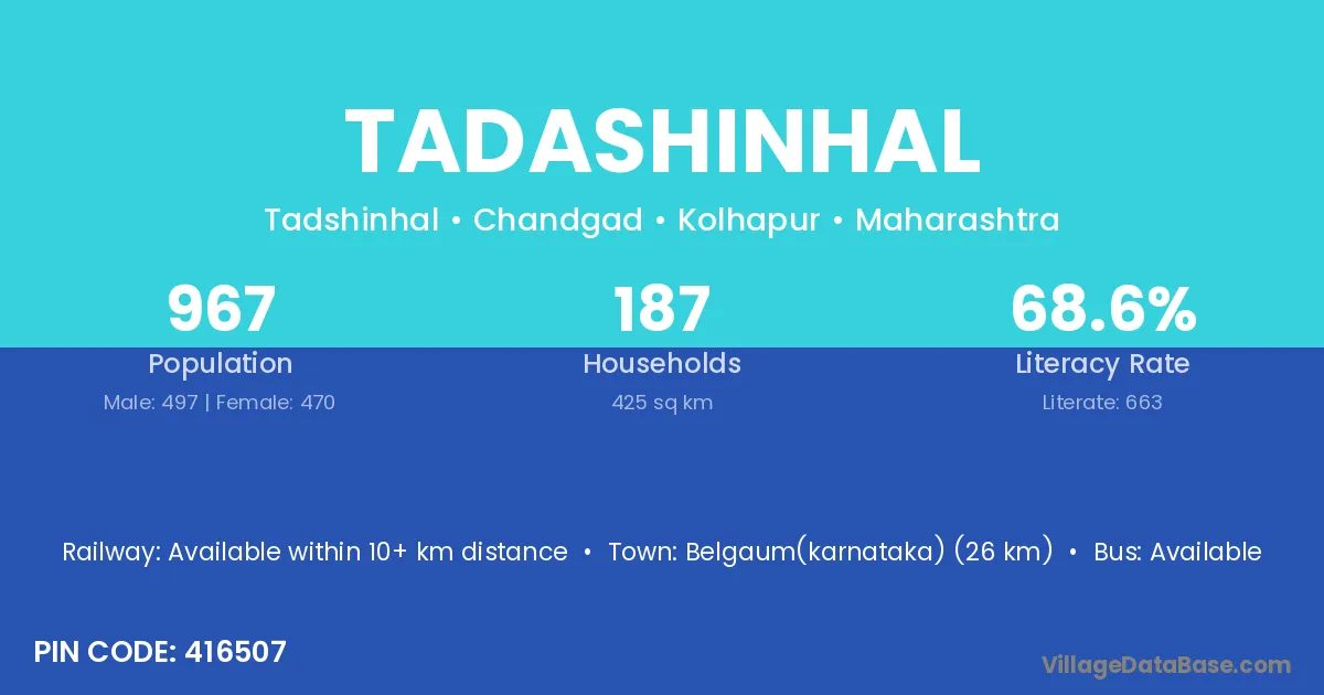 Belgaum(karnataka) (26 km) is the nearest town to Tadashinhal village for major economic activities and is located approximately 26 km away.
