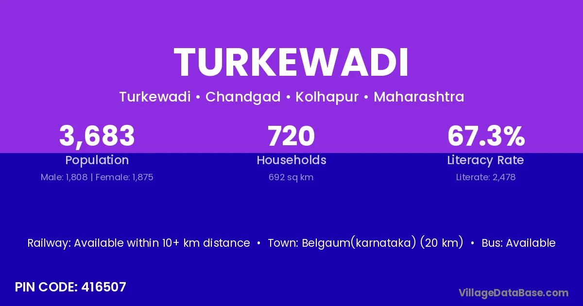 Turkewadi village has a total population of 3,683 people, of which 1,808 are males and 1,875 are females.