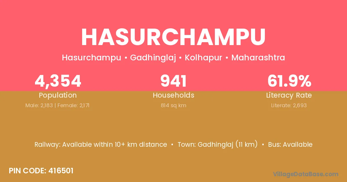 Gadhinglaj (11 km) is the nearest town to Hasurchampu village for major economic activities and is located approximately 11 km away.