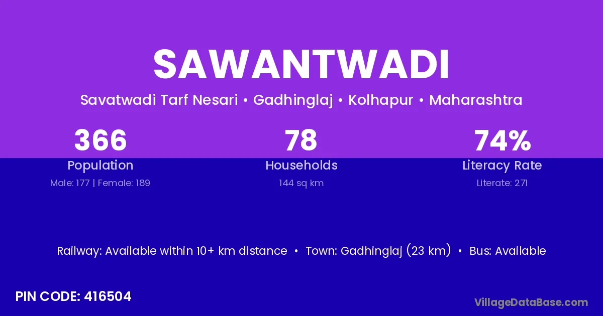 Gadhinglaj (23 km) is the nearest town to Sawantwadi village for major economic activities and is located approximately 23 km away.