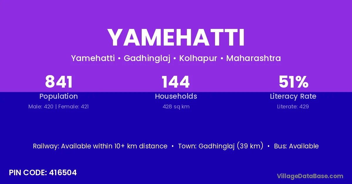 Gadhinglaj (39 km) is the nearest town to Yamehatti village for major economic activities and is located approximately 39 km away.