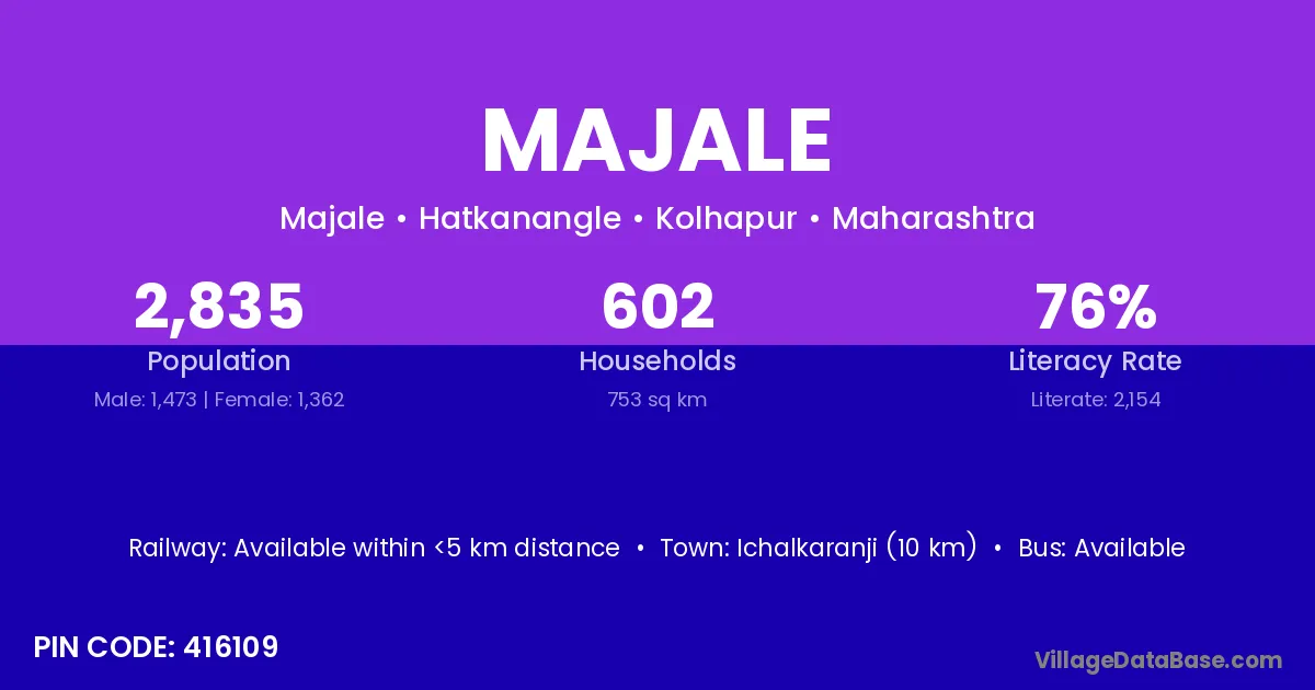 Ichalkaranji (10 km) is the nearest town to Majale village for major economic activities and is located approximately 10 km away.