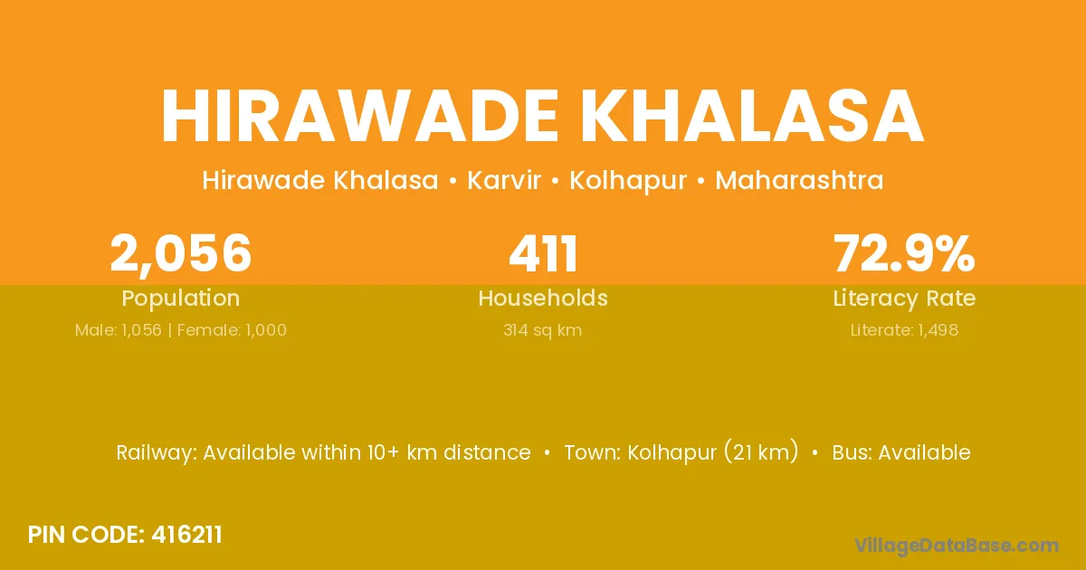 According to Census 2011 information, the village code of Hirawade Khalasa village is 416211.