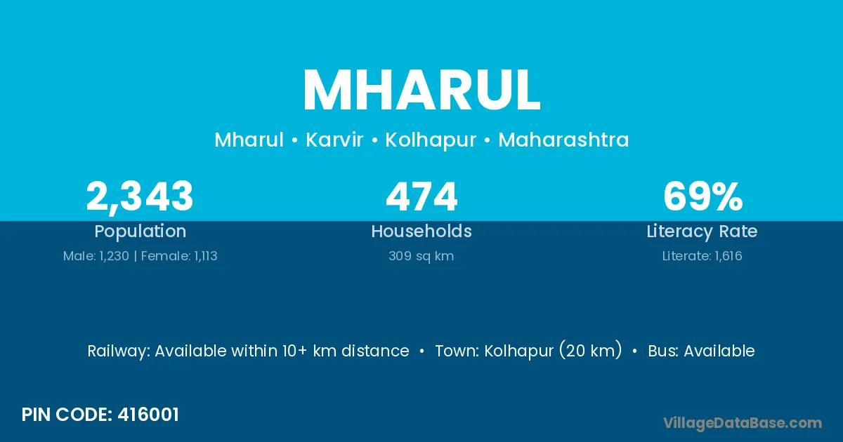 Kolhapur (20 km) is the nearest town to Mharul village for major economic activities and is located approximately 20 km away.