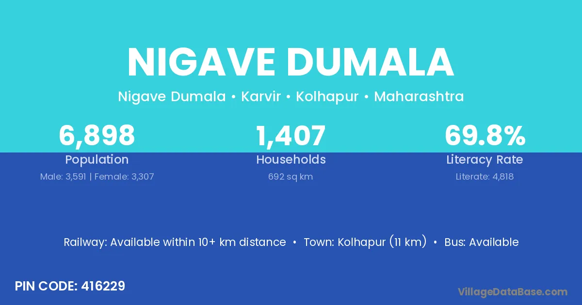 Kolhapur (11 km) is the nearest town to Nigave Dumala village for major economic activities and is located approximately 11 km away.