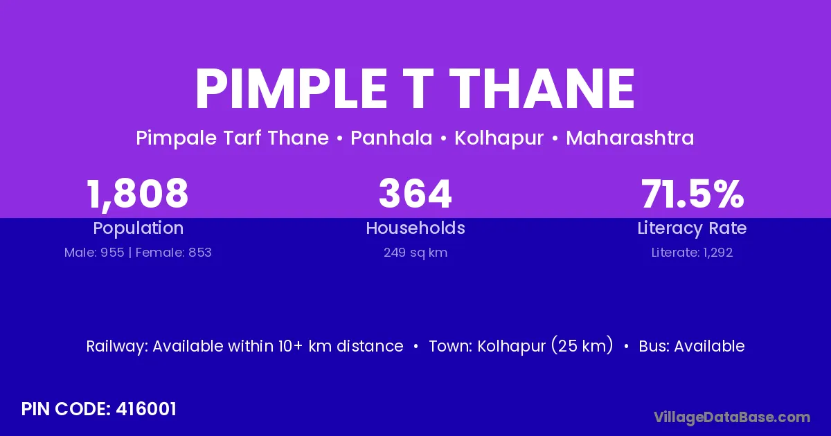 Kolhapur (25 km) is the nearest town to Pimple T Thane village for major economic activities and is located approximately 25 km away.