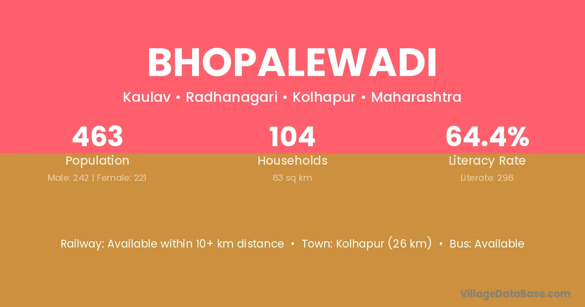 Bhopalewadi village has a total population of 463 people, of which 242 are males and 221 are females.