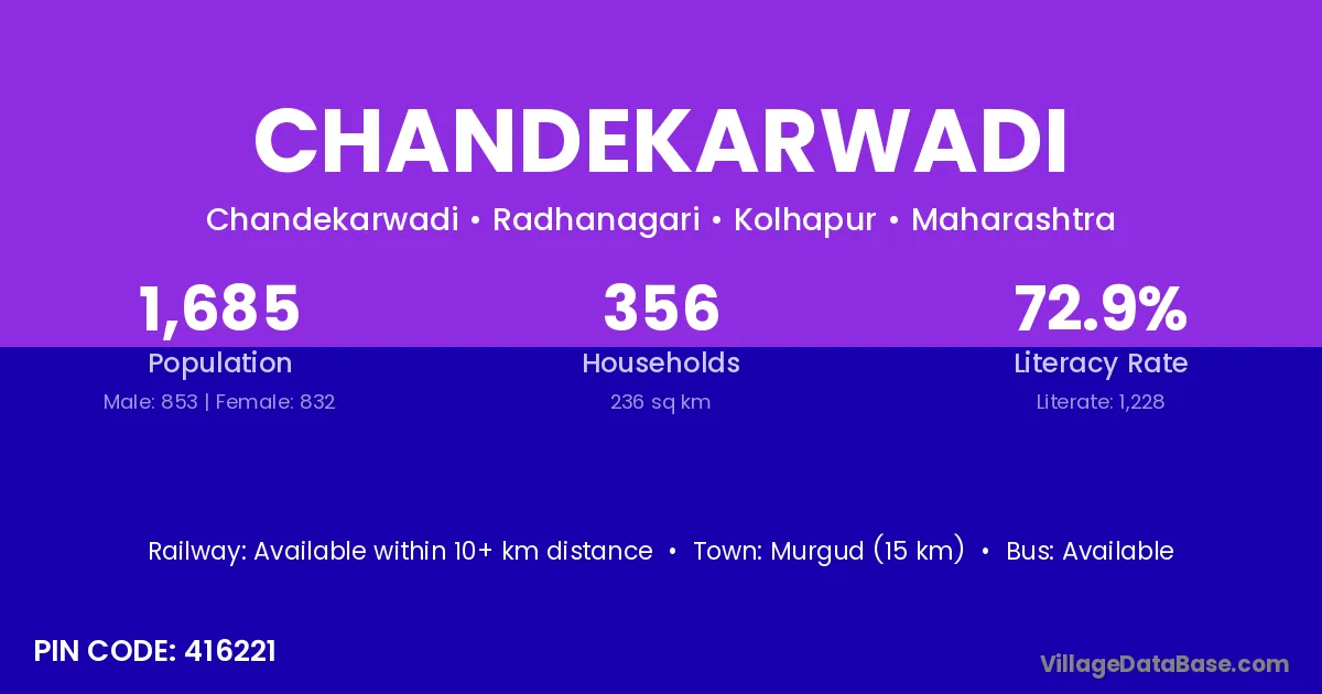 Chandekarwadi village has a total population of 1,685 people, of which 853 are males and 832 are females.