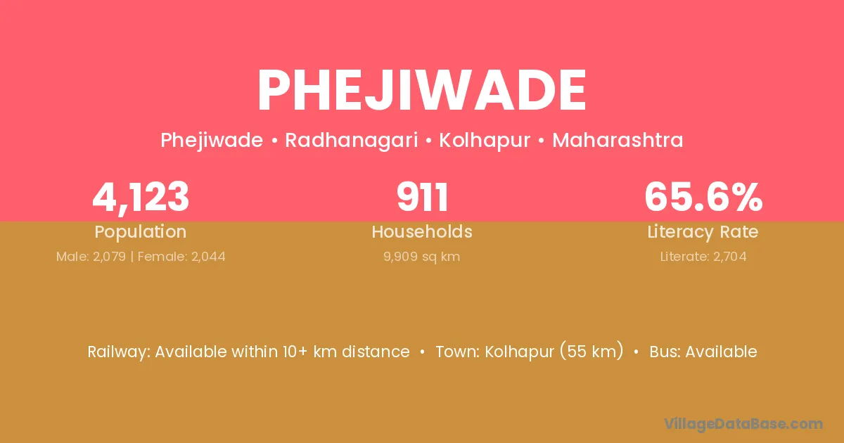 Kolhapur (55 km) is the nearest town to Phejiwade village for major economic activities and is located approximately 55 km away.