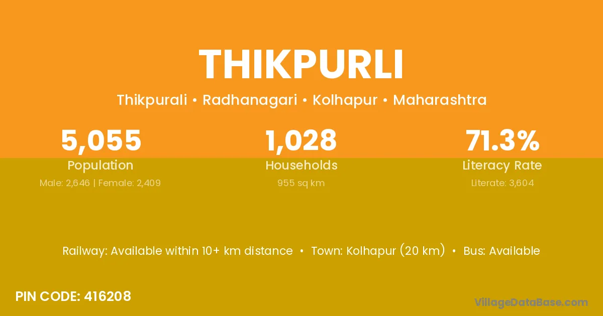 Kolhapur (20 km) is the nearest town to Thikpurli village for major economic activities and is located approximately 20 km away.