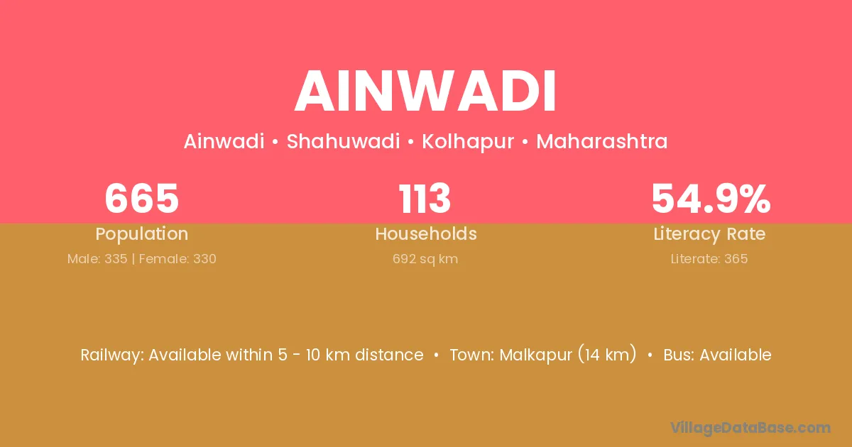 Ainwadi village has a total population of 665 people, of which 335 are males and 330 are females.