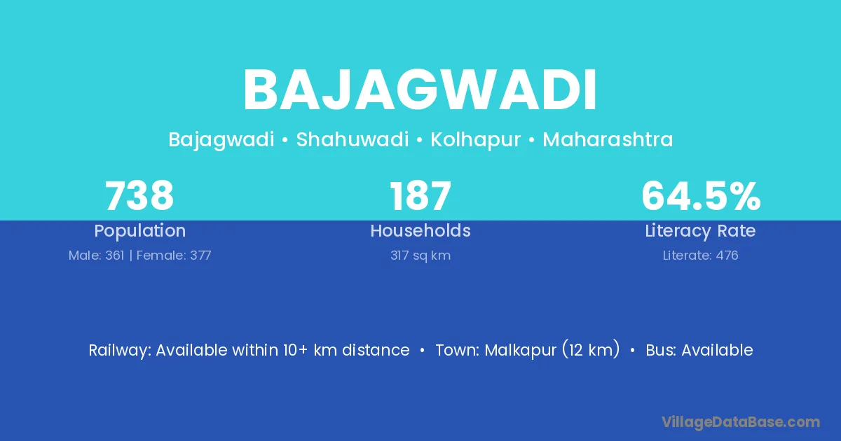 Bajagwadi village has a total population of 738 people, of which 361 are males and 377 are females.