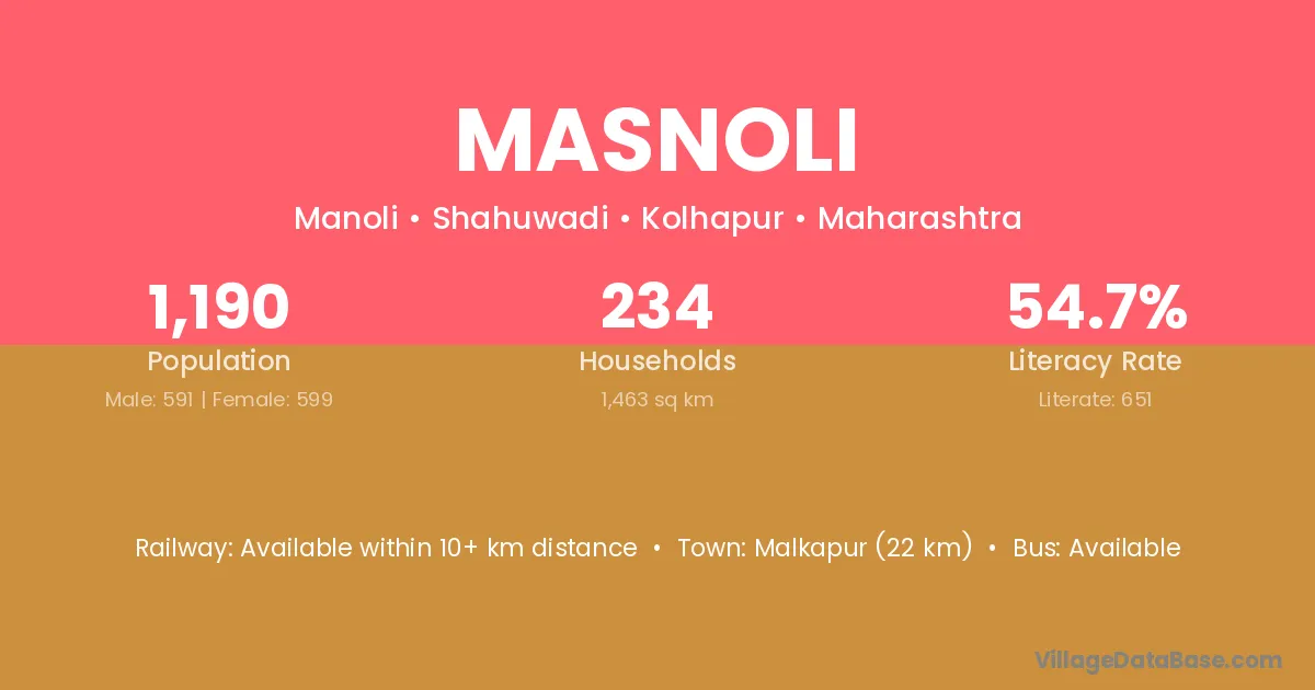 Masnoli village has a total population of 1,190 people, of which 591 are males and 599 are females.