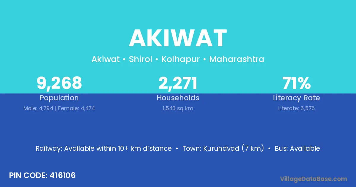 Kurundvad (7 km) is the nearest town to Akiwat village for major economic activities and is located approximately 7 km away.