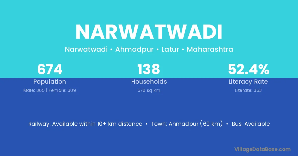 Ahmadpur (60 km) is the nearest town to Narwatwadi village for major economic activities and is located approximately 60 km away.