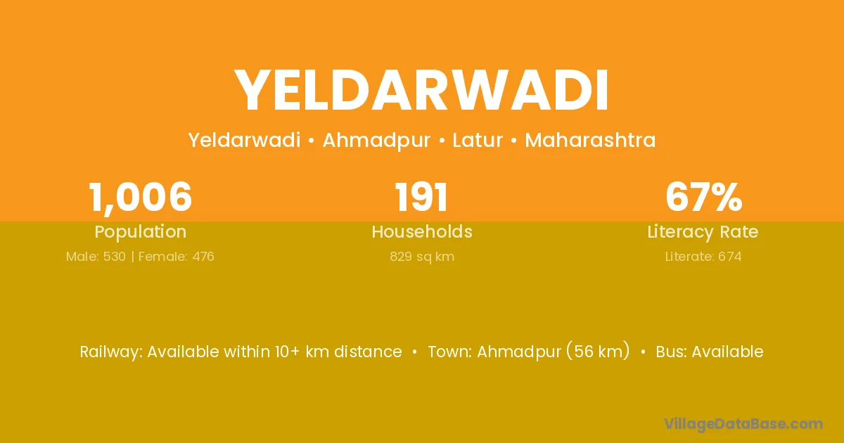 Ahmadpur (56 km) is the nearest town to Yeldarwadi village for major economic activities and is located approximately 56 km away.