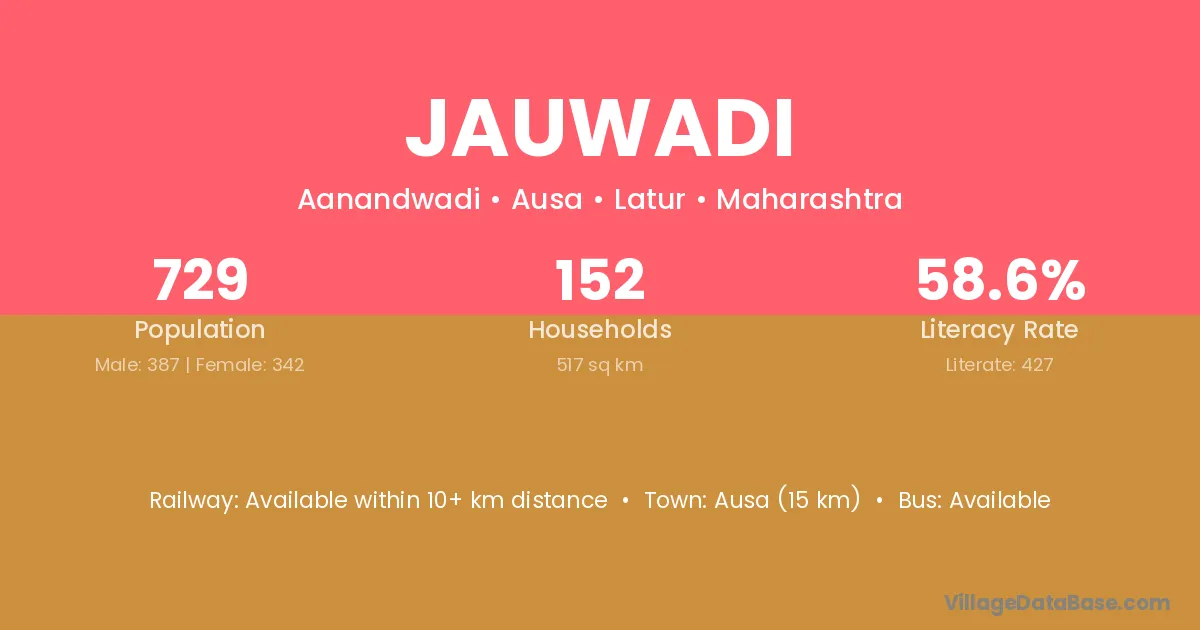 Ausa (15 km) is the nearest town to Jauwadi village for major economic activities and is located approximately 15 km away.