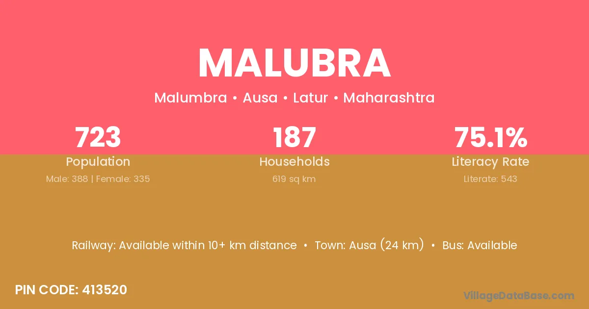 Ausa (24 km) is the nearest town to Malubra village for major economic activities and is located approximately 24 km away.