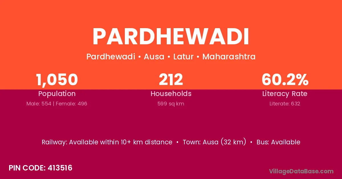 Ausa (32 km) is the nearest town to Pardhewadi village for major economic activities and is located approximately 32 km away.