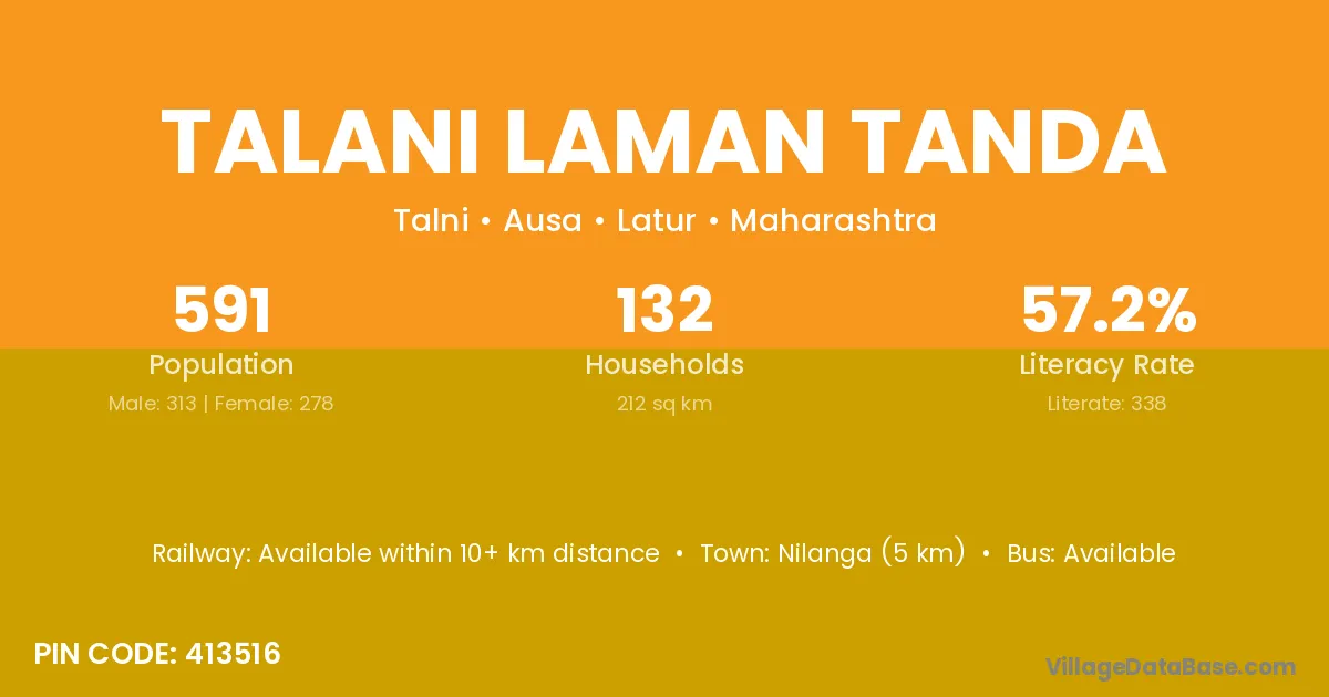 Nilanga (5 km) is the nearest town to Talani Laman Tanda village for major economic activities and is located approximately 5 km away.