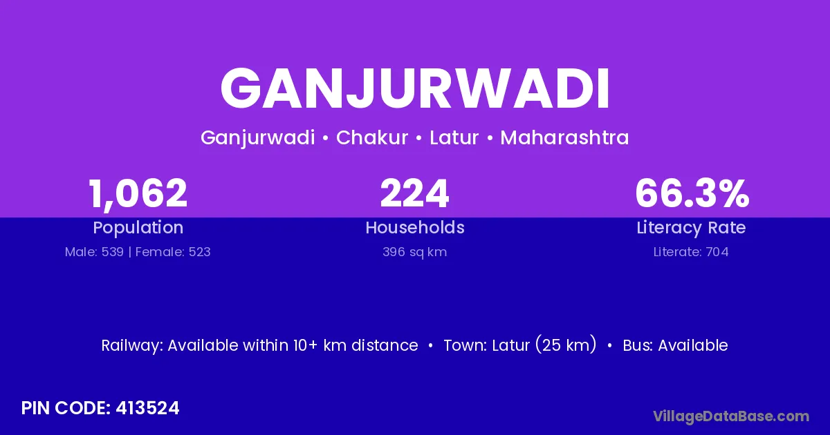 Ganjurwadi village has a total population of 1,062 people, of which 539 are males and 523 are females.
