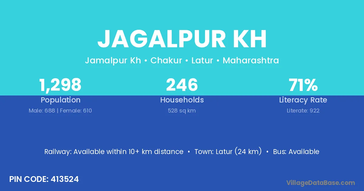 Latur (24 km) is the nearest town to Jagalpur Kh village for major economic activities and is located approximately 24 km away.