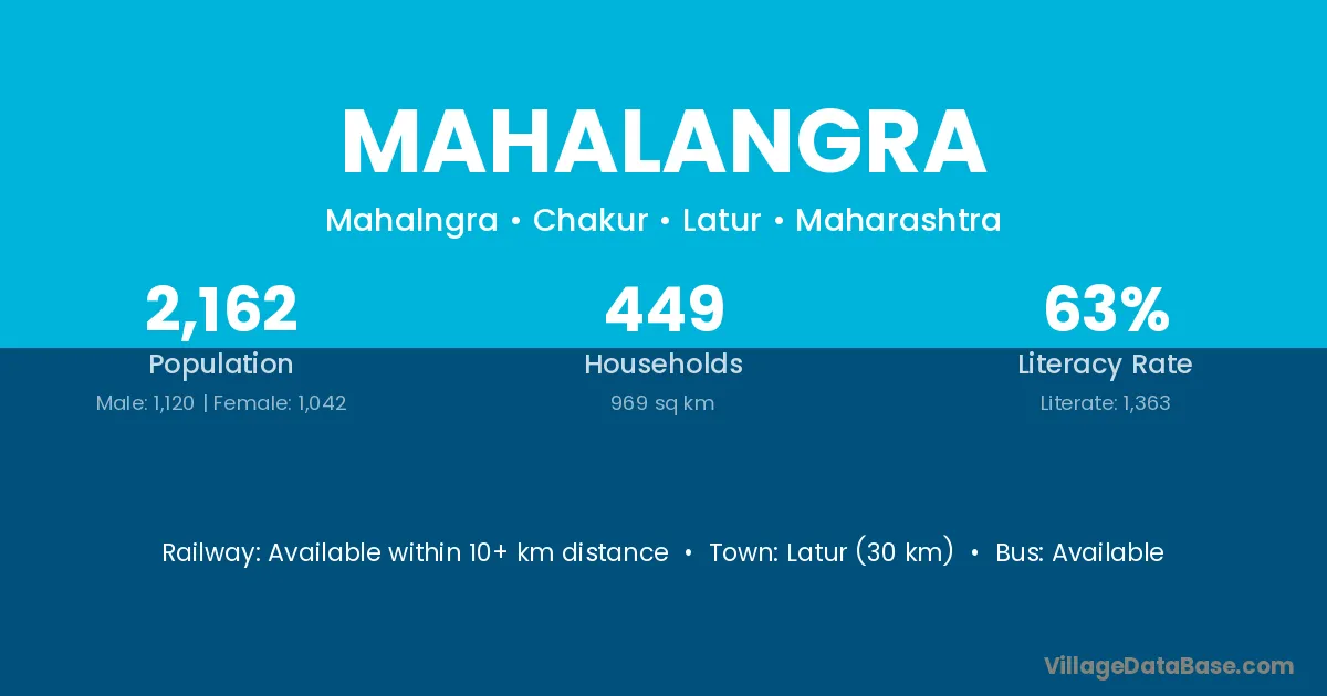 Latur (30 km) is the nearest town to Mahalangra village for major economic activities and is located approximately 30 km away.