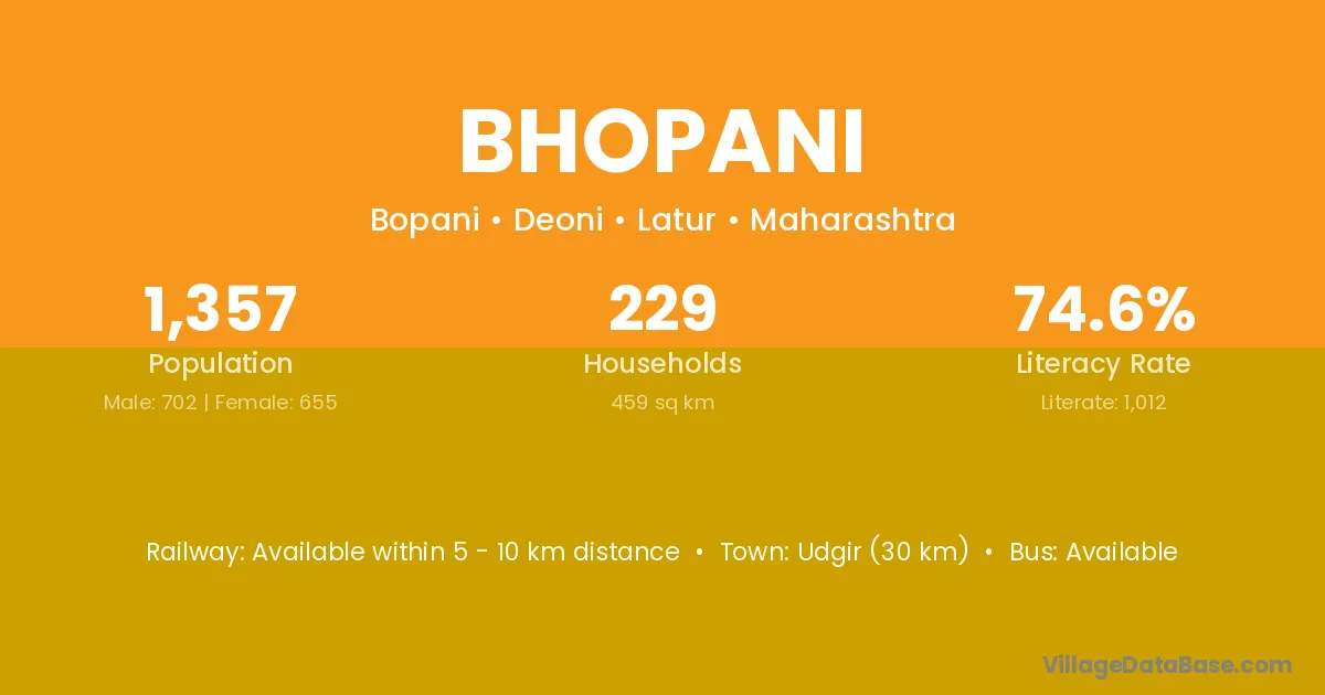 Udgir (30 km) is the nearest town to Bhopani village for major economic activities and is located approximately 30 km away.