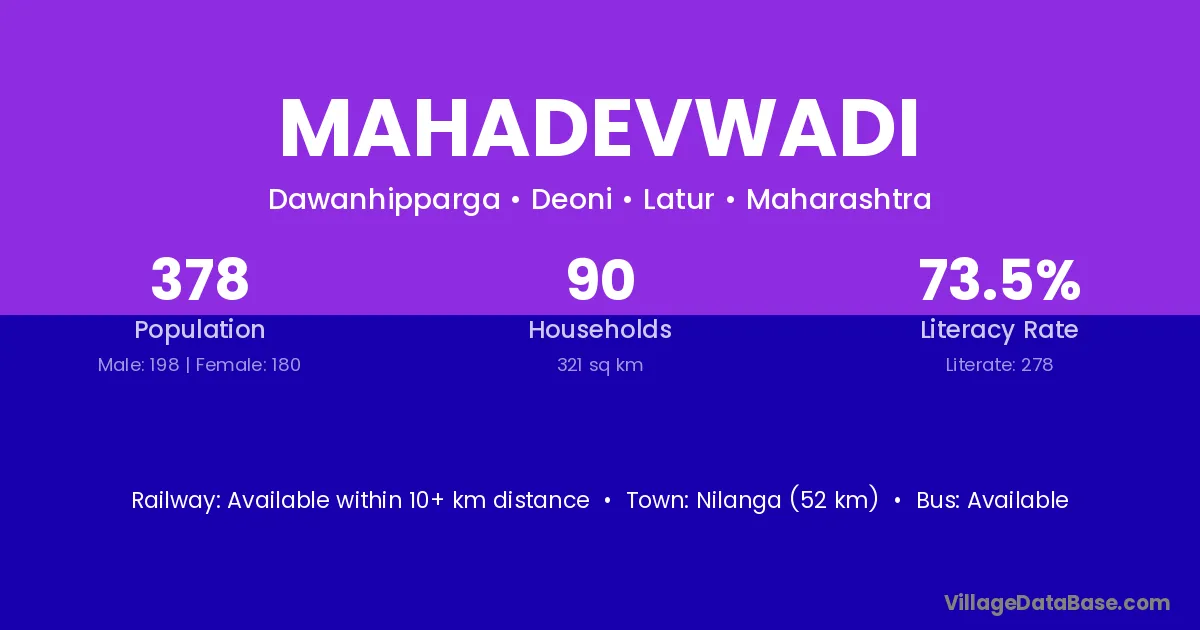 Mahadevwadi village has a total population of 378 people, of which 198 are males and 180 are females.