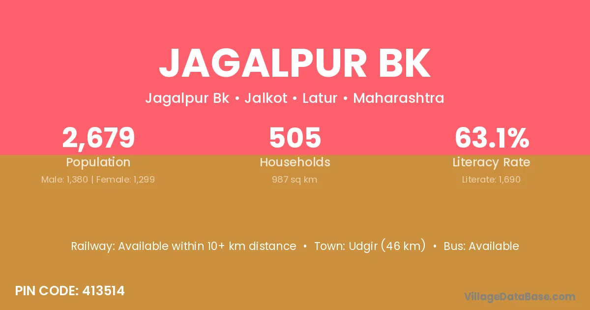 Udgir (46 km) is the nearest town to Jagalpur Bk village for major economic activities and is located approximately 46 km away.