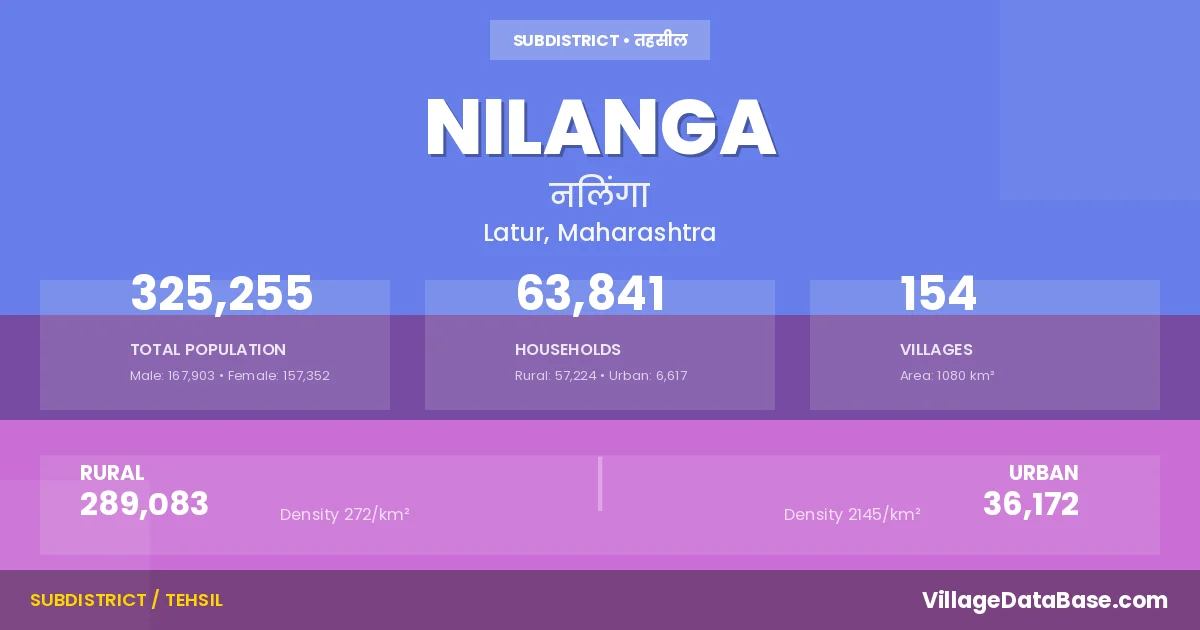 According to the 2011 census The total area of Nilanga Tehsil is 1080 km², with a population of 325255 people. The population density is 301 inhabitants per square kilometre, and there are approximately 63841 houses in the sub district.