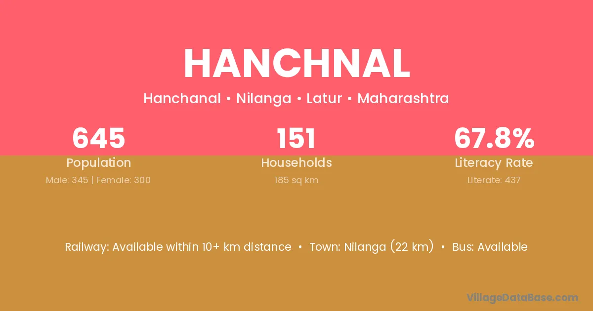 Nilanga (22 km) is the nearest town to Hanchnal village for major economic activities and is located approximately 22 km away.